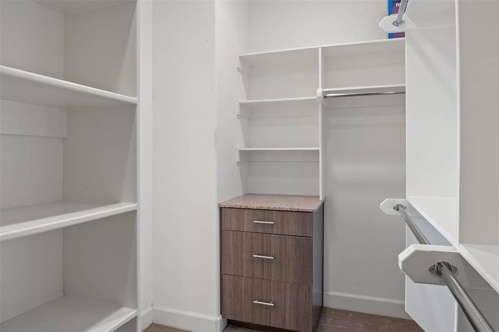 The primary suite serves as a private retreat with a seating area, custom walk-in closet with built-in drawers, and an oversized shower featuring dual Speakman showerheads, including a rain feature. A secondary bedroom also includes its own en-suite bath and walk-in closet.