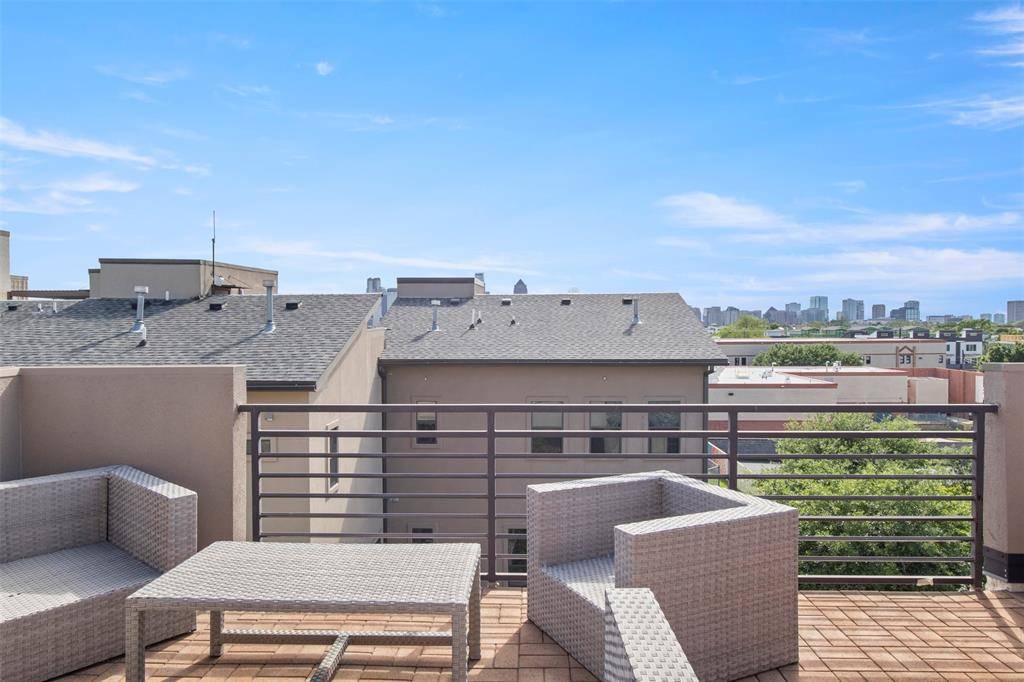 Enjoy multiple outdoor living options with three distinct spaces: a ground-level patio with a turfed, fenced yard; a second-floor terrace adjacent to the living area; and a spacious rooftop deck with panoramic views of the Downtown Dallas skyline and Fair Park.